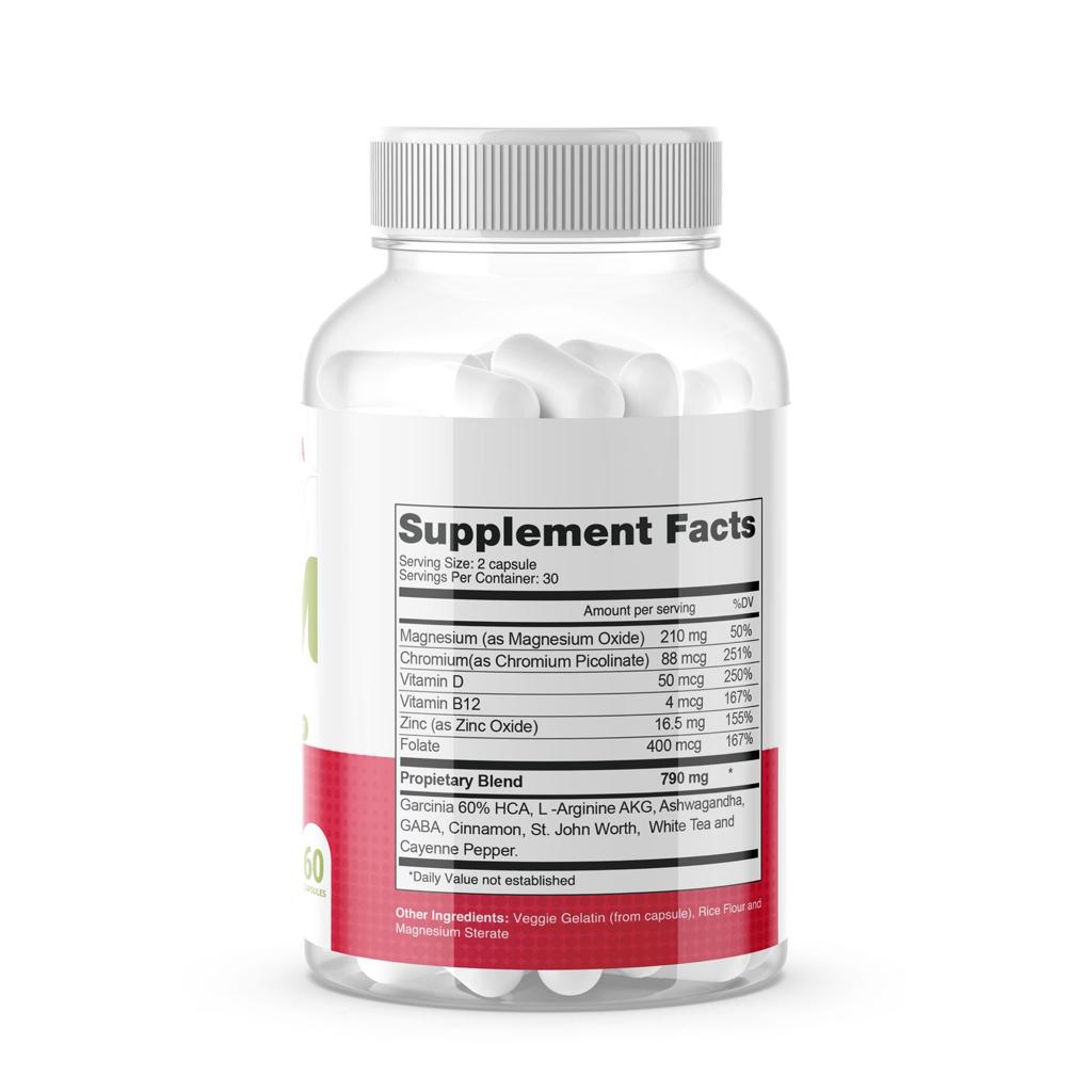 Esta fórmula está diseñada para el alivio de ansiedad y disminuir el estrés crónico de forma natural. Las cápsulas SLIM contienen hierbas cuidadosamente seleccionadas, vitaminas y botánicos que disminuyen los niveles de cortisol y ghrelina (hormona del hambre. El estrés crónico y los niveles más altos de cortisol son factores clave que contribuyen al aumento de peso y resistencia a la insulina. La combinación de Magnesio y Zinc son cofactores importantes en la creación de serotonina y dopamina, dos neurotransmisores que desempeñan un papel muy importante en el estado de ánimo, la relajación y también influye en la actividad de GABA, el principal neurotransmisor inhibitorio en el cerebro que está involucrado en la ansiedad. L- Arginina AKG es un aminoácido que facilita la lipólisis y por lo tanto ayuda a disminuir la grasa corporal. La Garcinia, Ashwagandha, GABA, hierba de San Juan trabajan para mejorar las funciones cerebrales, la relajación y la capacidad natural del cuerpo para hacer frente al estrés. SLIM contiene ingredientes naturales, seguros, sin efectos secundarios y no adictivo. Libre de cafeína, azúcar y gluten. Incluye vitaminas, aminoácidos, minerales y hierbas para apoyar un sistema nervioso más saludable, mejorar la pérdida de peso, ayudar a reducir la ansiedad y el estrés. Potente fórmula sin goteo elaborado en Estados Unidos, en una instalación registrada por la FDA, bajo los estrictos requisitos de buena práctica de fabricación. SLIM Contiene: Magnesio, chromium, vitamina D, vitamina B12, Zinc, Folate, Garcinia 60% HCA, cayenne pepper, cinnamon, GABA, St John’s Wort, Ashwaganda, white tea and L-Arginine AKG. Instrucciones: Tome dos (2) cápsulas vegetales SLIM una vez al día. Para obtener los mejores resultados, tome 20-30 minutos antes de una comida con un vaso de agua de 8 oz o según las indicaciones de su profesional de la salud.   Preguntas frecuentes